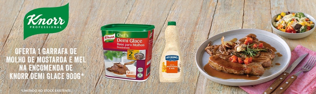 Aproveite este mês a oferta de Helmmann`s Mostarda e Mel. Basta encomendar Knorr Demi Glace de 900 gramas, de modo a receber a oferta de uma garrafa. Melhore a eficácia e sabor dos seus pratos com estes dois produtos de qualidade superior.
