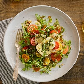 Queijo Mozarela, amêndoa, tomate cherry e claro, Hellmann’s molho para saladas Vinagrete 3Lt compõem esta deliciosa receita.