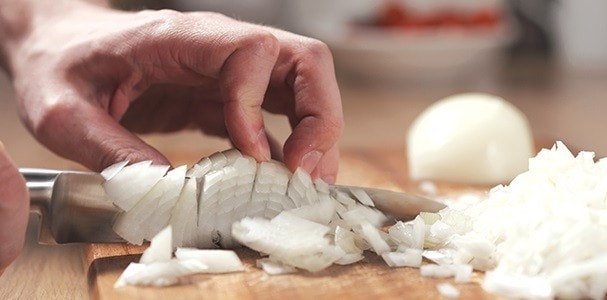 • CEBOLA: deve ser cortada no sentido da cada metade deve ser cortada sem se separar junto à raiz. Esta parte deve ficar oposta ao bico da faca , devendo ser cortada em duas ou três alturas consoante o tamanho da cebola