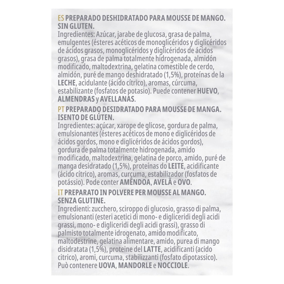 Açúcar, xarope de glicose, gordura de palma, emulsionantes (ésteres acéticos de mono e diglicéridos de ácidos gordos, mono e diglicéridos de ácidos gordos), gordura de palma totalmente hidrogenada, amido modificado, maltodextrina, gelatina de porco, amido, puré de manga desidratado (1,5%), proteínas do LEITE, acidificante (ácido cítrico), aromas, curcuma, estabilizador (fosfatos de potássio). Pode conter AMÊNDOA, AVELÃ e OVO.