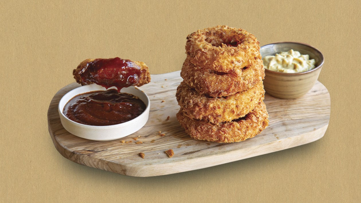 • Escorrer os aros de cebola. Passar por farinha temperada, depois pela polme líquida e, por fim, pela mistura de pão ralado.