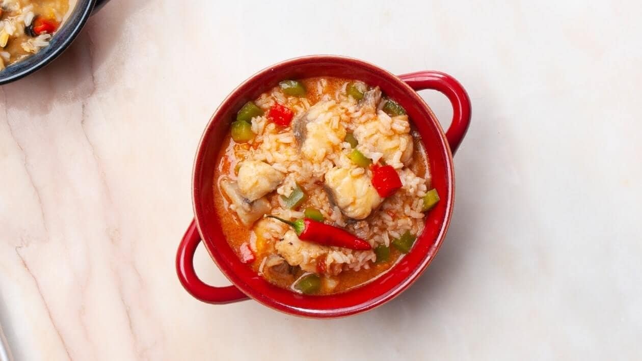 • Ferver Knorr caldo pasta Peixe preparado juntamente com os pimentos e o tamboril.