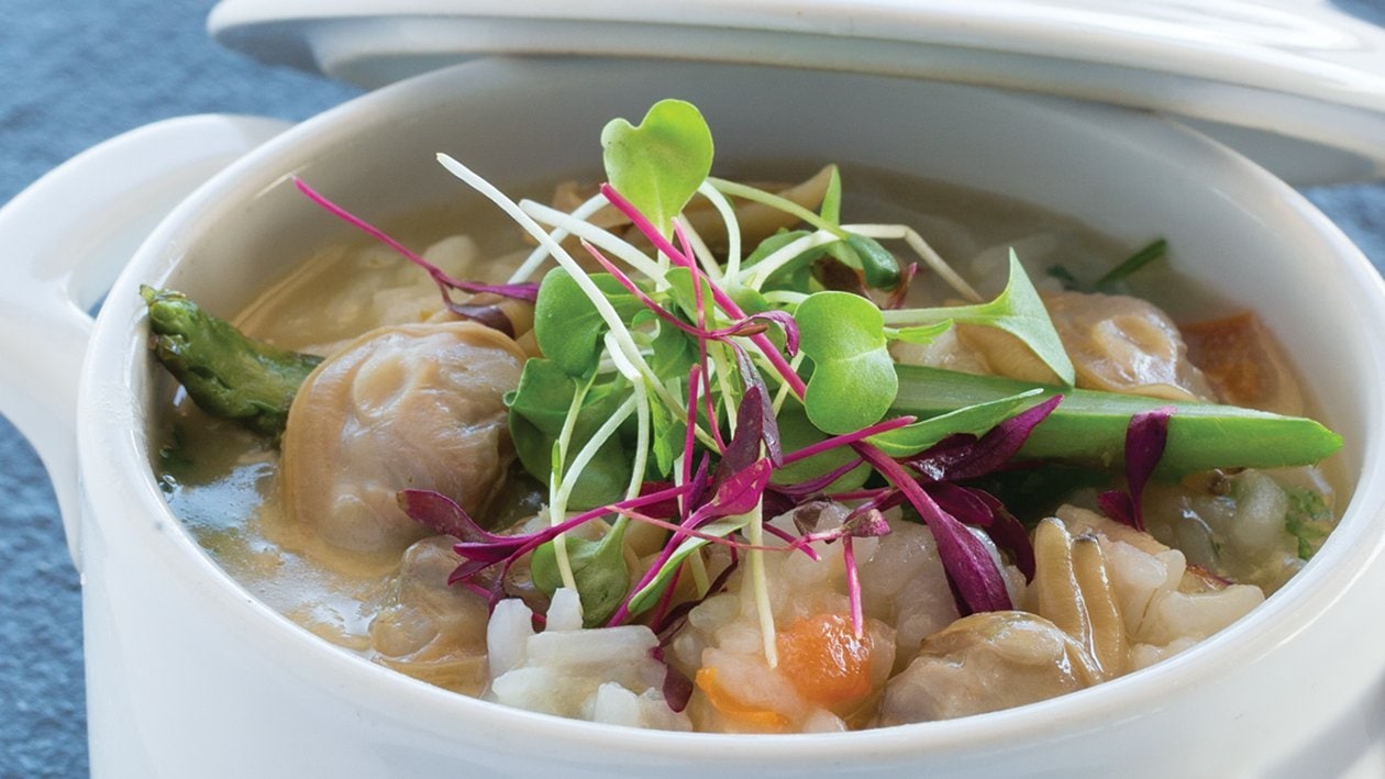 Cremoso e consistente arroz acompanhado de um tributo ao Poeta e gracejado de pequenas folhas de coentros.