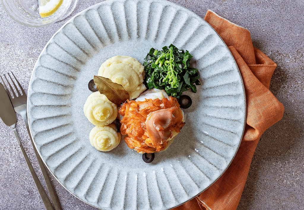 • Num tabuleiro gastronorm, juntar azeite, os lombos bacalhau e o Knorr puré de batata preparado.