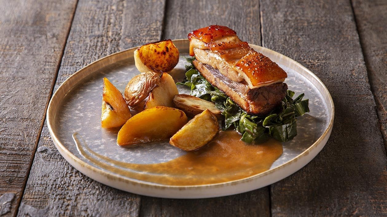 • Num tabuleiro colocar Knorr Caldo Líquido Concentrado Carne preparado e a Barriga de Porco barrada com pimentão doce.