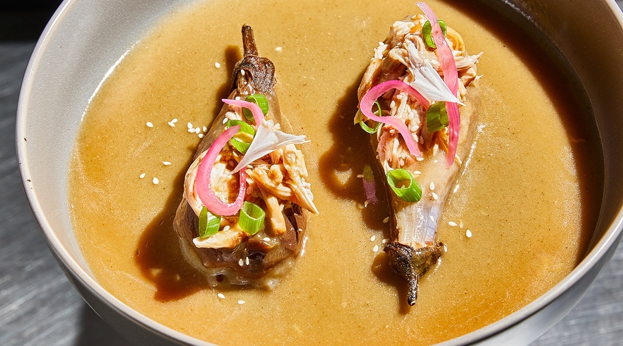 Inspire-se nos Menus do Futuro e faça esta receita de Berinjela Grelhada com Escabeche de Frango, Miso & xerez