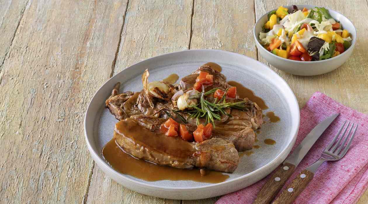 Num sauté, colocar azeite, as cabeças de alho esmagadas com casca e juntar o alecrim. A seguir, cozinhar o bife previamente temperado com sal. Acrescentar aoKnorr Demi Glace preparado, o tomate aos cubos para lhe conferir um pouco de acidez. Empratar a gosto.