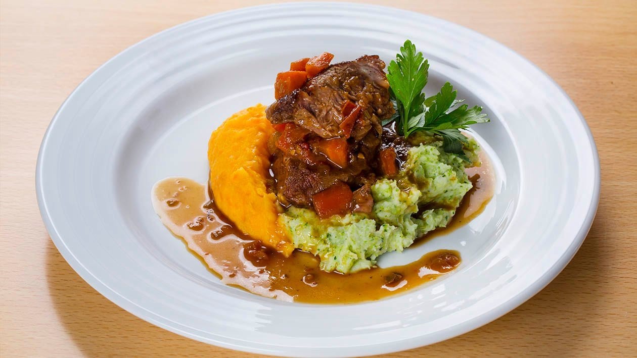 • Servir as bochechas de porco com os dois purés.