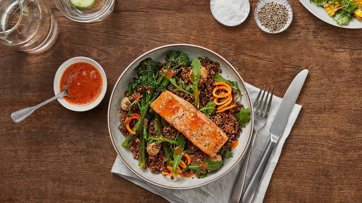 • Numa taça, colocar a rúcula, a quinoa, os cogumelos e os grelos, o esparguete de cenoura e o salmão.