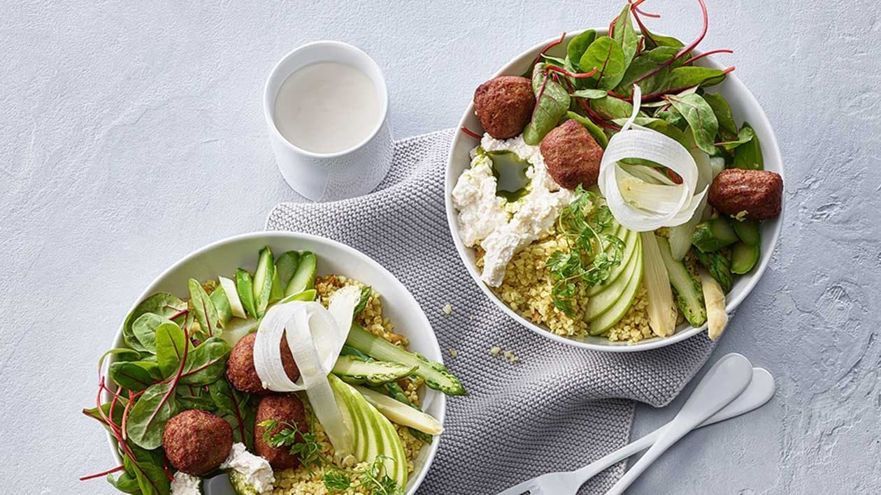 • No fundo da bowl, colocar o bulgur hidratado. Numa ponta colocar as folhas de acelgas, de seguida os espargos e a maçã, depois as almôndegas e por fim o queijo creme.