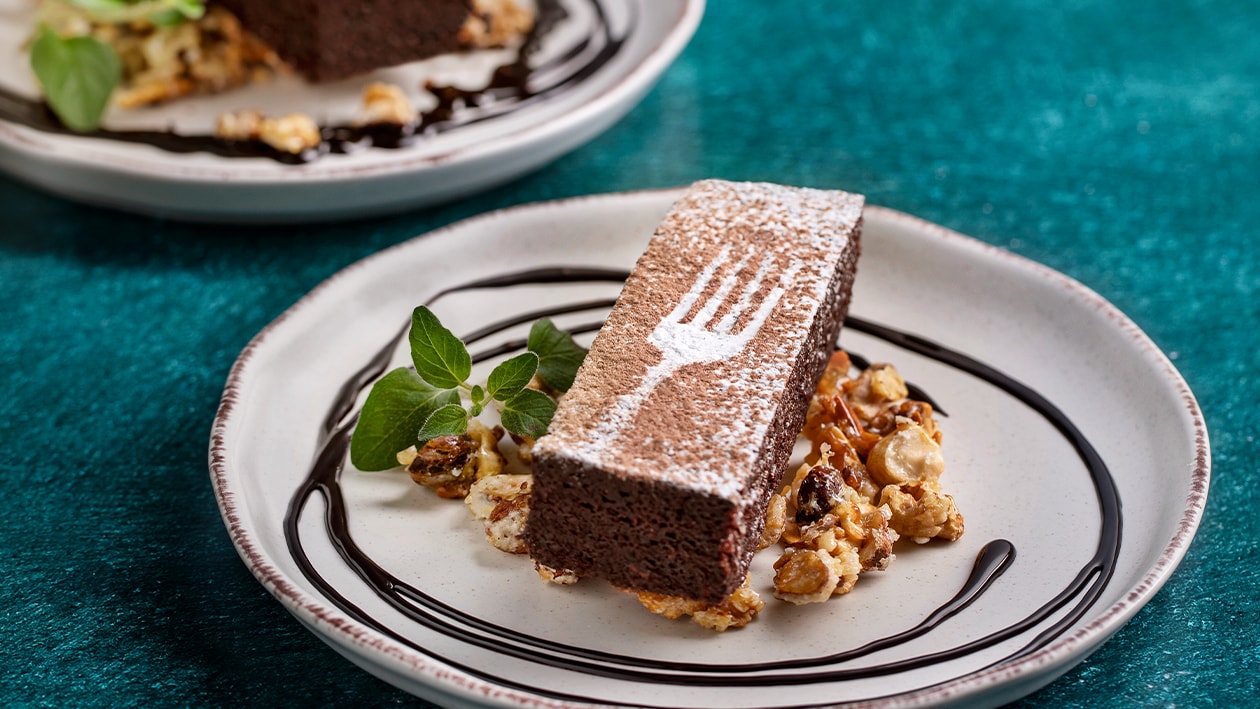• Colocar o nogat no centro do prato, por cima a fatia de brownie e finalizar com topping de chocolate.