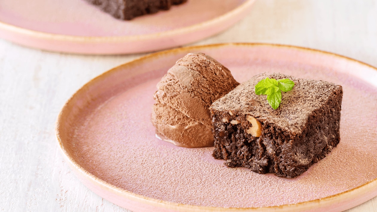 • Depois de frio, desenformar e cortar o brownie em quadrados e servir com uma bola de gelado.