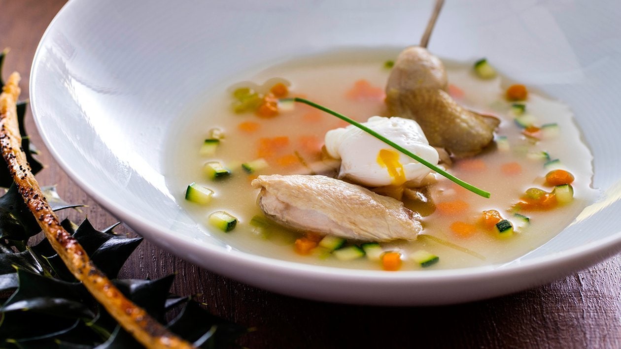 • Colocar a carne, o caldo com os legumes, o ovo e por fim o cebolinho.