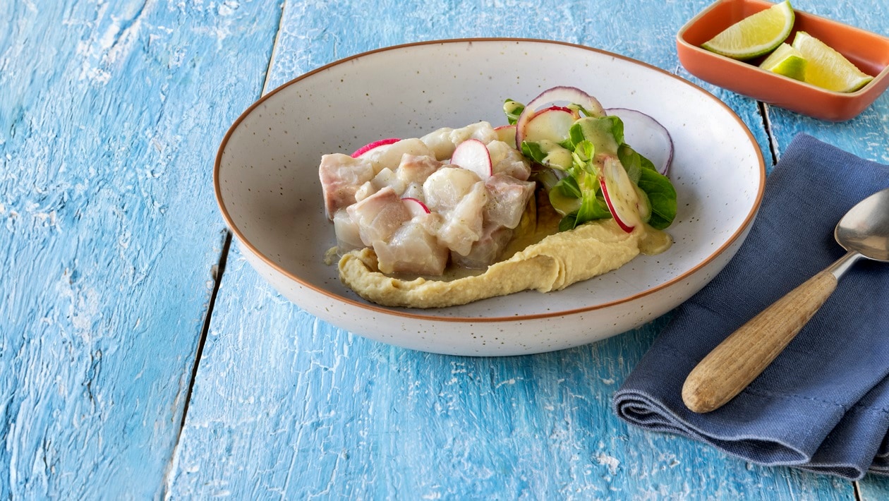 ceviche acompanhado com um cremoso puré de grão e salada com Hellmann´s Molho Vinagrete