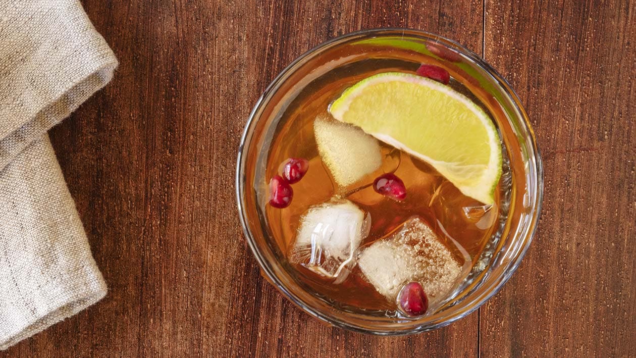 • Colocar o limão e a romã nos copos, encher de gelo e deitar o chá frio.