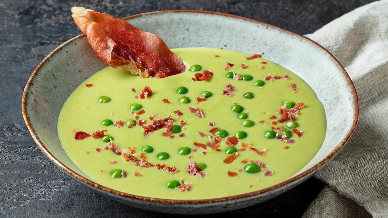 • Guarnecer o creme de ervilhas com o presunto crocante em pedaços e ervilhas inteiras.