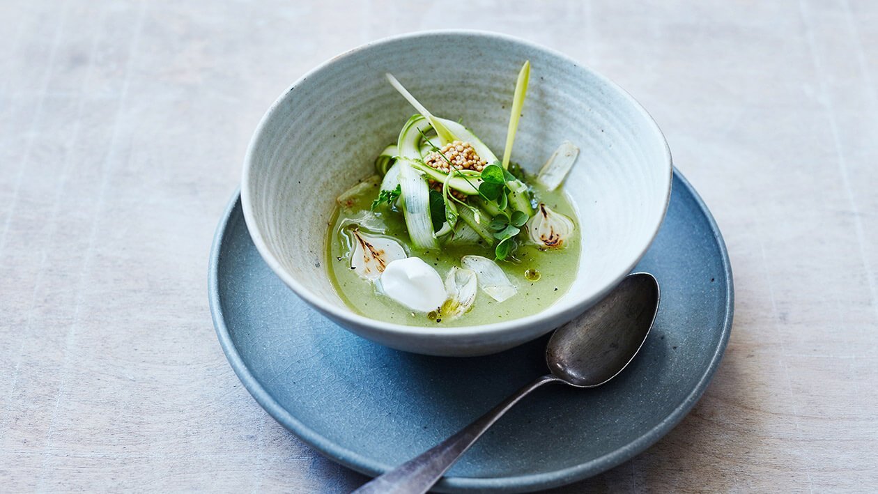 • Guarnecer o creme de espargos com a cebolinha corada e o laminado de espargos frescos.