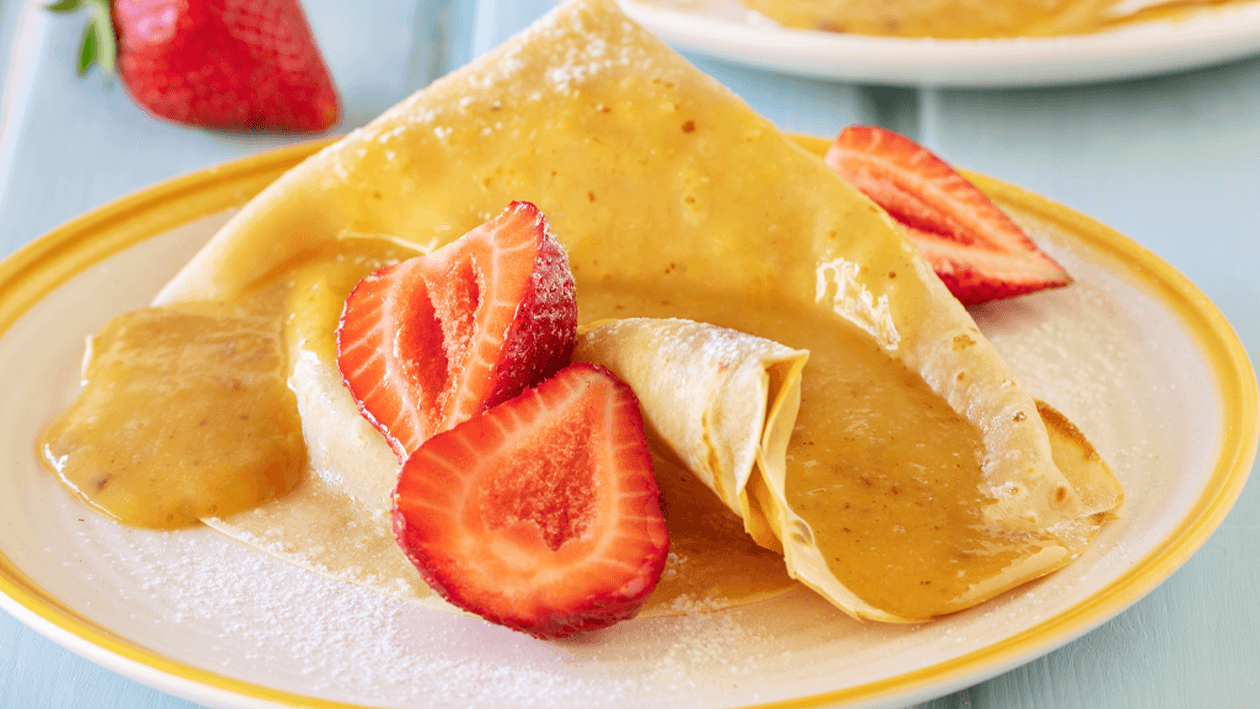 • Colocar o crepe no centro do prato e servir juntamente com o Doce de Amêndoa Carte D'Or e morangos frescos.