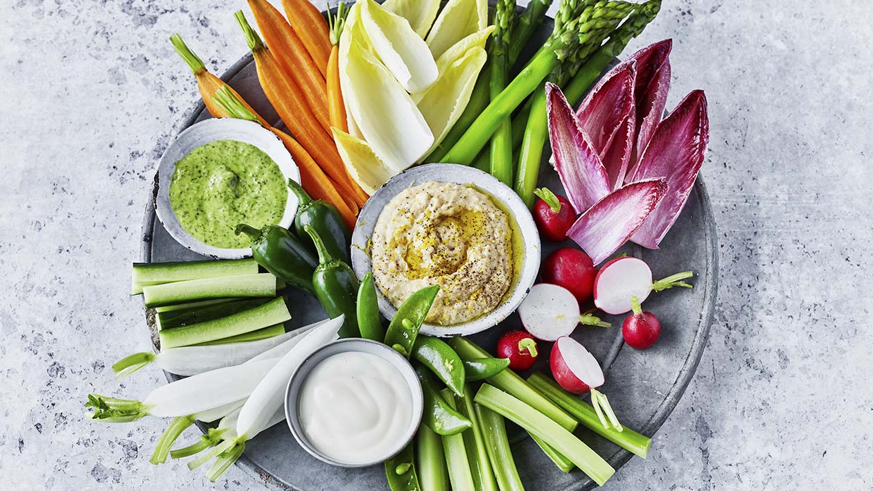 • Empratar os vegetais numa tábua com o molho pesto, hummus eHellmann's Molho Iogurteem pequenas taças.