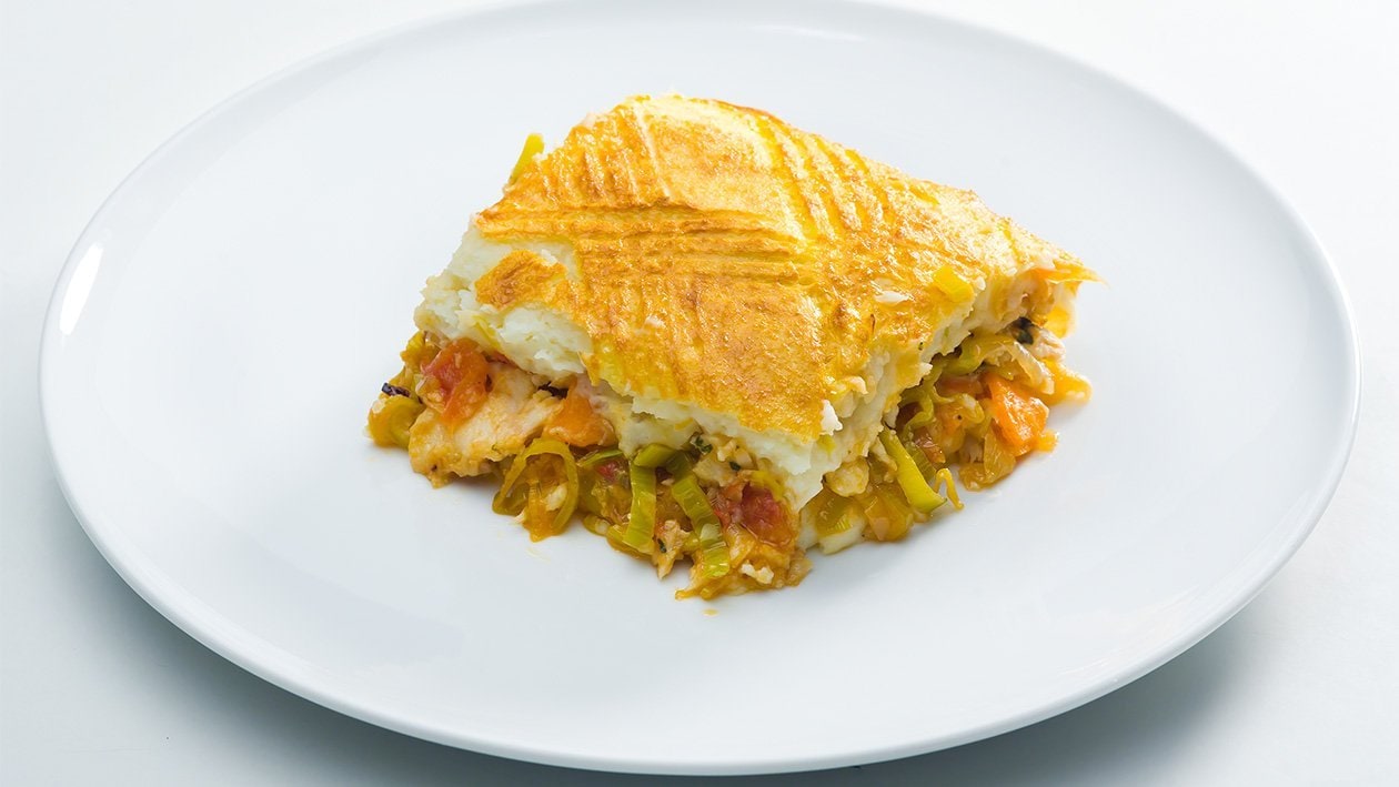 • Colocar o puré no tabuleiro, depois o preparado de peixe e finalizar com puré;