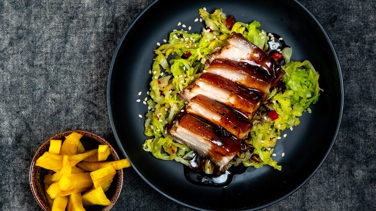 • Deixar cozinhar 1h30min. em lume brando. Noutra panela, preparar um caldo com os 600ml de água, Knorr molho Teriyaki 1Lt, o gengibre, a cebola e o alho. Retirar a barriga de uma panela para a outra e deixar cozer mais 1h30 min no caldo anteriormente preparado. Rodar a peça de carne de vez em quando. Depois deste tempo, retirar a carne e deixar reduzir o molho. Servir com couve salteada e batata frita.