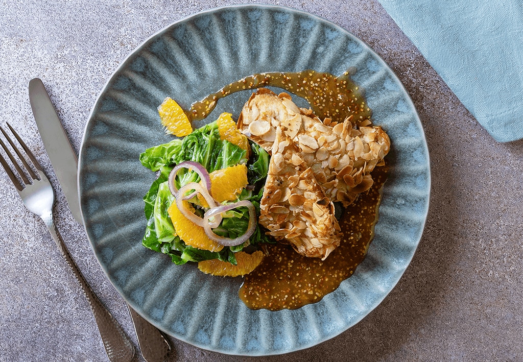• Panar em farinha, OvoChef ovo inteiro e amêndoa laminada.
