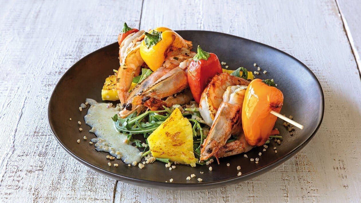 • Grelhar as gambas e os pimentos. Retirar e colocar em espetos.