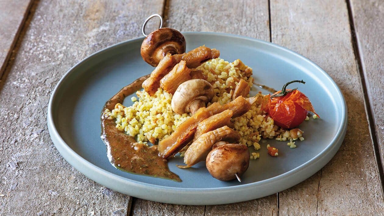 • Colocar Knorr Bulgur numa taça ou tabuleiro gastronómico. Hidratar com a água fervente e tapar com película aderente. Esperar 20 minutos até estar hidratado.