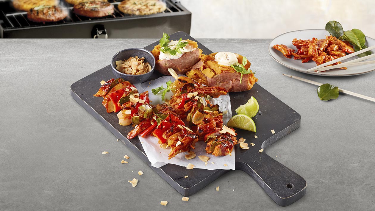 • Grelhar durante 8-10 min, virando de vez em quando. Depois de pronto, pincelar com o resto da marinada e colocar lascas de coco por cima.