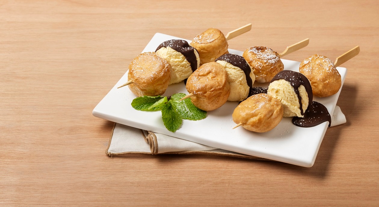 Carte D´Or Profiteroles e gelado em espeto regados com Carte D´Or Topping de Chocolate Crocante
