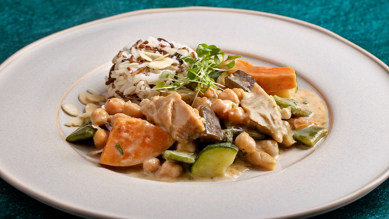 Inspire-se com a nossa receita de estufado de legumes com caril, arroz selvagem e amêndoa!