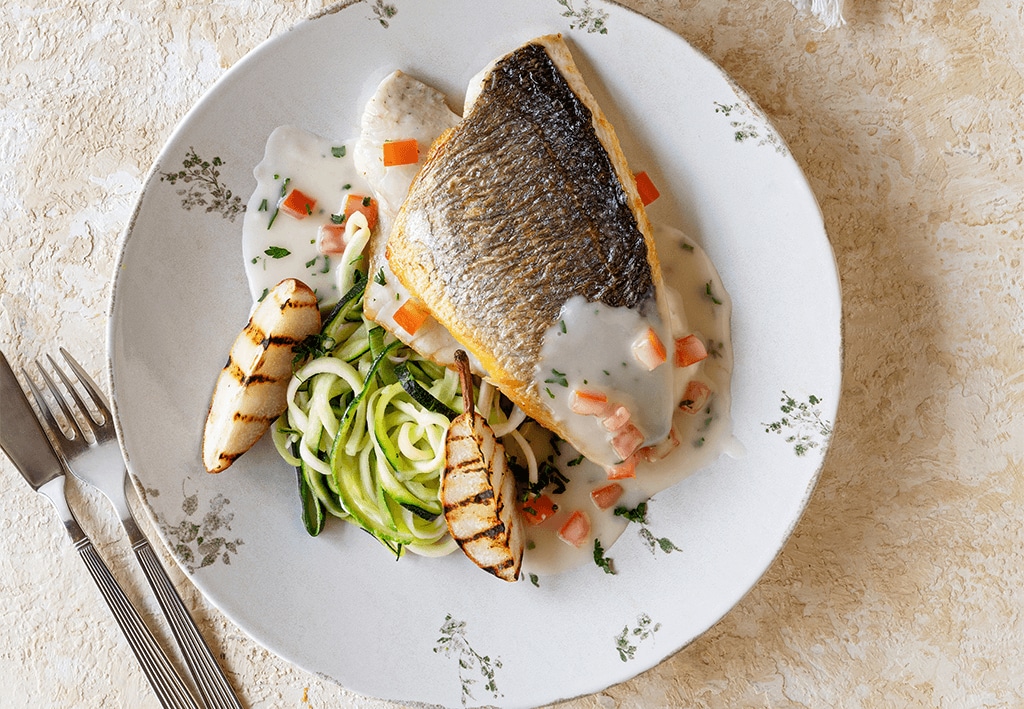 • Servir os filetes de dourada com esparguete de courgete salteado e pera rocha grelhada.