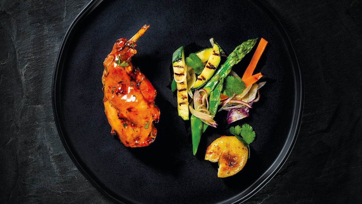 • Napar o frango com uma mistura de Knorr Sweet Chili, manjericão, gengibre e vinho Madeira. Servir laminado com os legumes assados e o tomate Cherry.