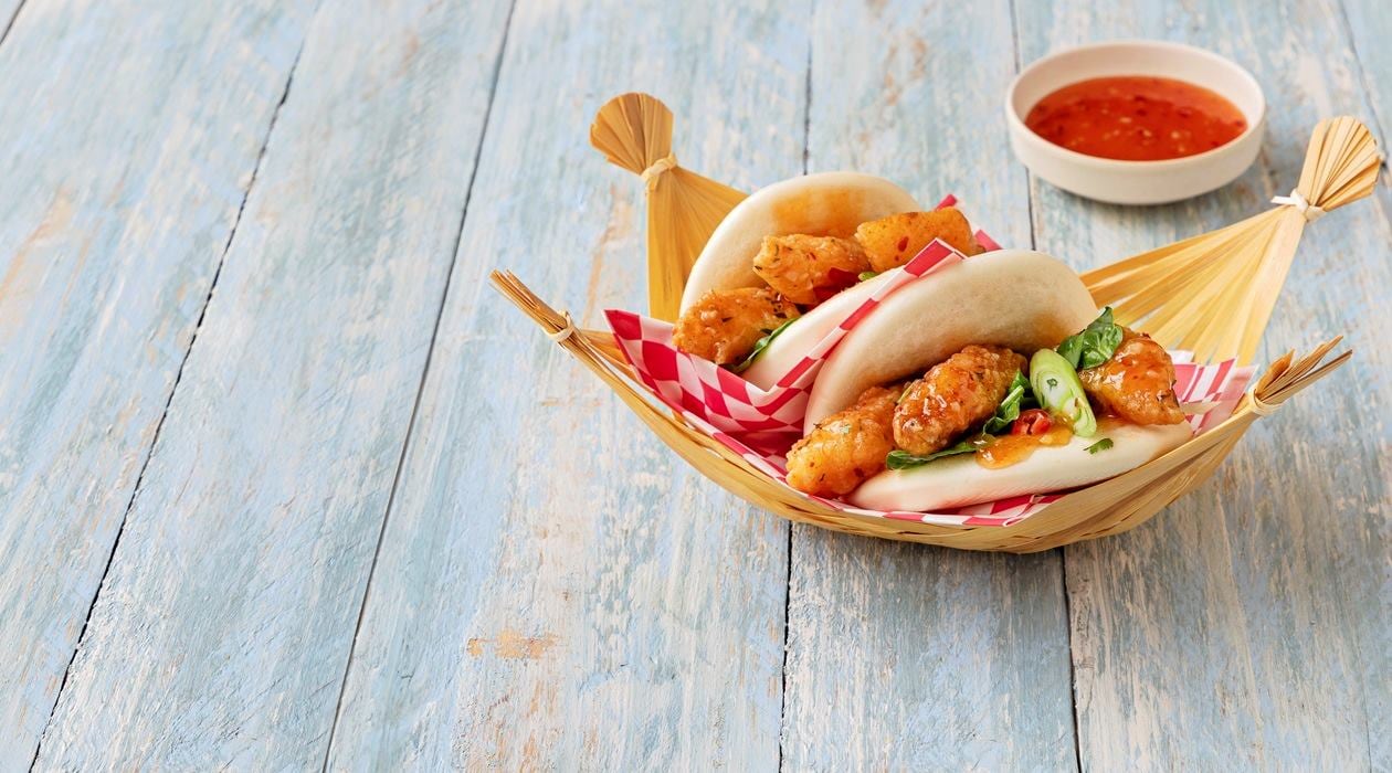 Experimente esta deliciosa receita com um sabor asiático: baao recheado com peixe frito, espinafres e Knorr Molho Sweet Chili.