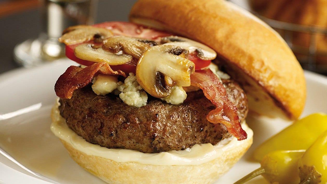 • Colocar na base Hellmann's Maionese. De seguida, colocar o hambúrguer, o queijo ricotta, o bacon, o tomate e os cogumelos.