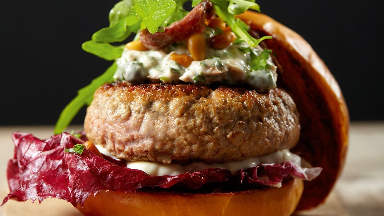 • De seguida molho, o hambúrguer, mais molho, pinhões, anchova e por fim rúcula.