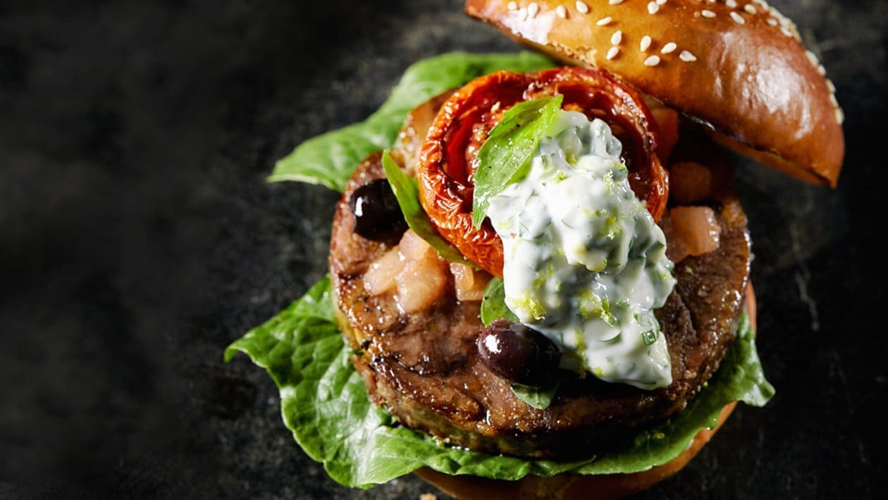 • De seguida, o hambúrguer, a cebolinha, as azeitonas, o tomate e por fim o molho;