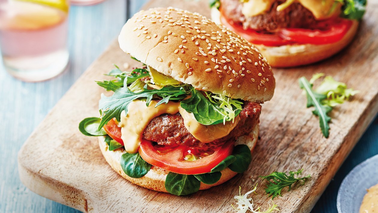 • Torrar o pão e colocar na base os espinafres. tomate. hambúrguer, alface roxa. rúcula e ruibarbo.