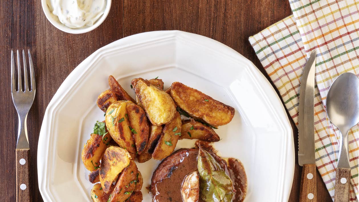 • Servir o hambúrguer com molho de vinho tinto por cima, juntamente com as batatas e maionese vegan à parte.