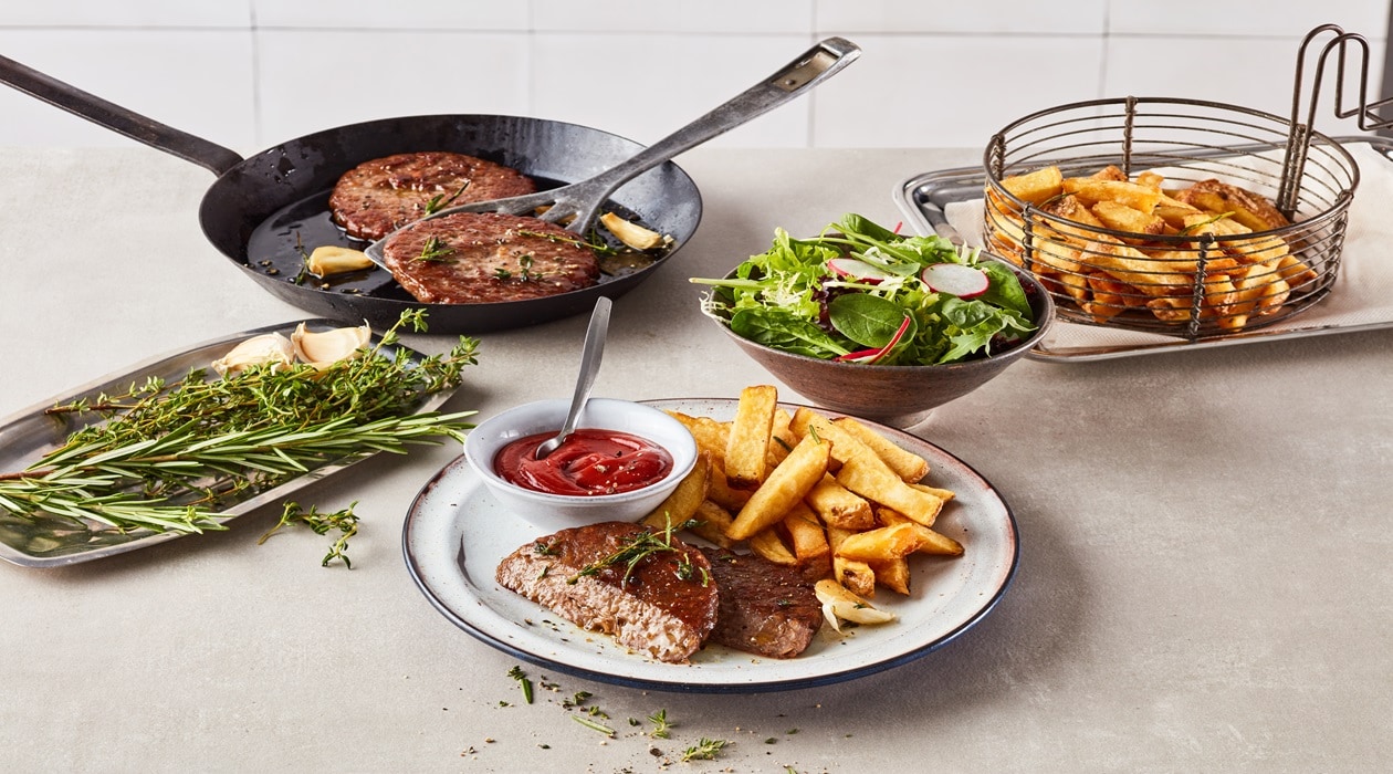 • Faça uma salada verde da sua preferência e frite as batatas fritas até dourar. ​