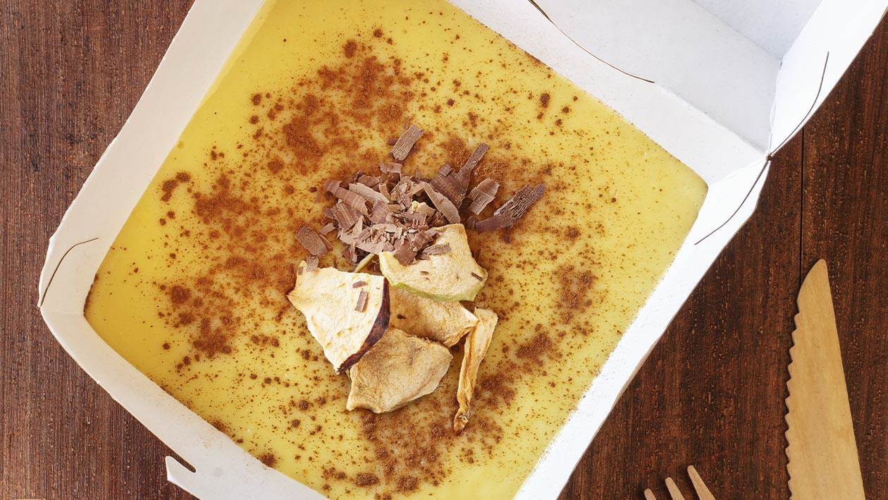 • Antes de servir, polvilhar com canela em pó. Por cima, colocar pedaços de maçã desidratada e raspas de chocolate.