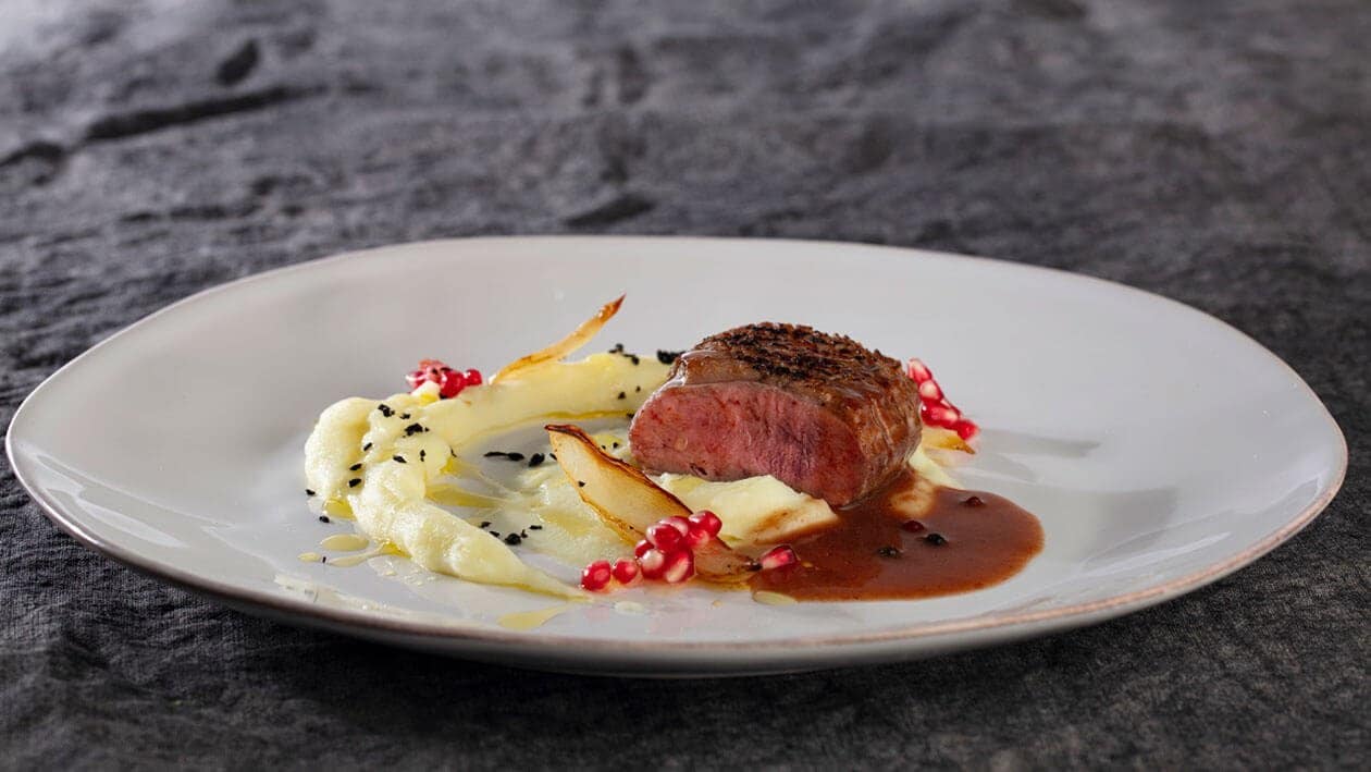 • Colocar o puré no centro do prato, metade do magret inteiro, a cebola caramelizada e o molho.