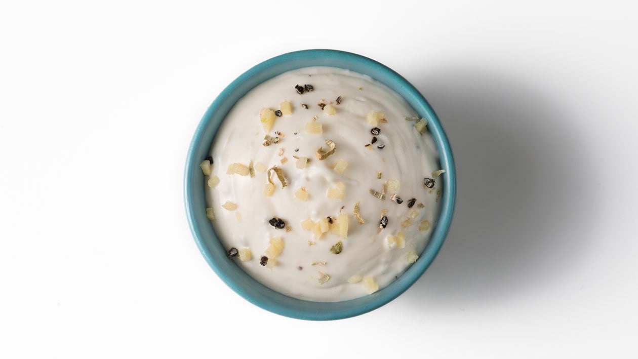 • Num recipiente, coloque a Hellmann’s Maionese Original, adicione o iogurte de ananás e o gengibre ralado.