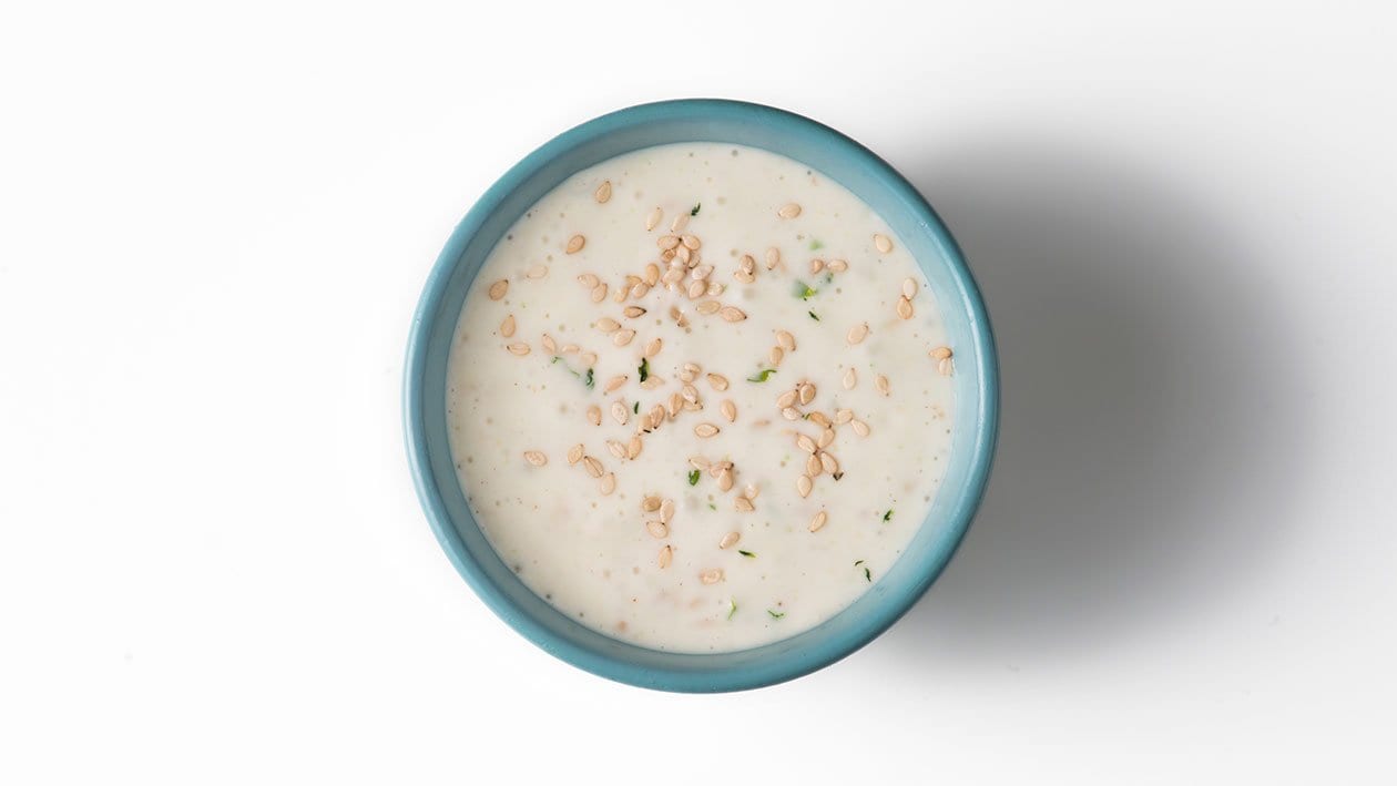 • Num recipiente, coloque a Hellmann’s Maionese Original, adicione a mistura de Hellmann’s molho para saladas Vinagrete com azeite, o sésamo tostado e o Knorr Primerba tempero pasta Manjericão.