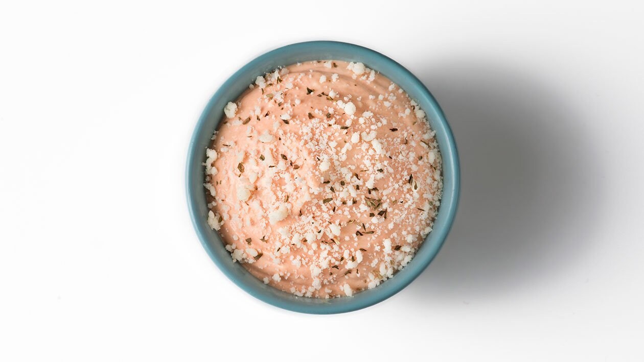 • Num recipiente, coloque a Hellmann’s Maionese Original e Hellmann's Ketchup, adicione tomate seco, orégãos e queijo parmesão ralado.
