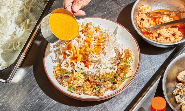 4. Para servir, despeje o molho de bisque de camarão sobre a massa frita e misture na frente do cliente.