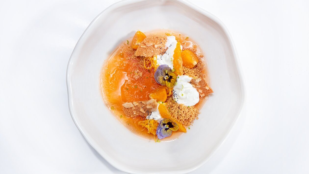 • Decorar com as physalis, a bolacha triturada, a laranja em gomos, as flores e por fim a raspa de lima por cima.