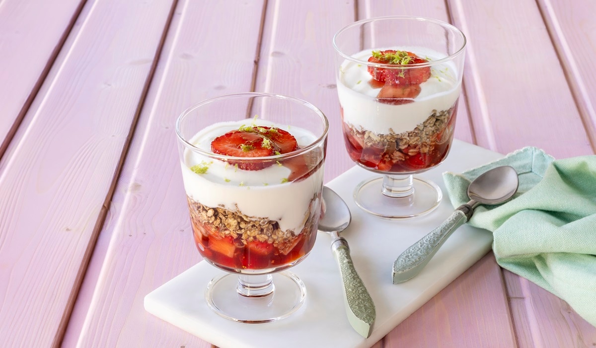 Finalizar com os restantes morangos frescos e um pouco mais de Carte D’Or Topping Morango e raspas de lima
