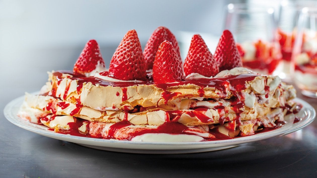 • Decorar a pavlova, colocando a nata entre camadas juntamente com polpa de morango, e por fim os morangos inteiros.