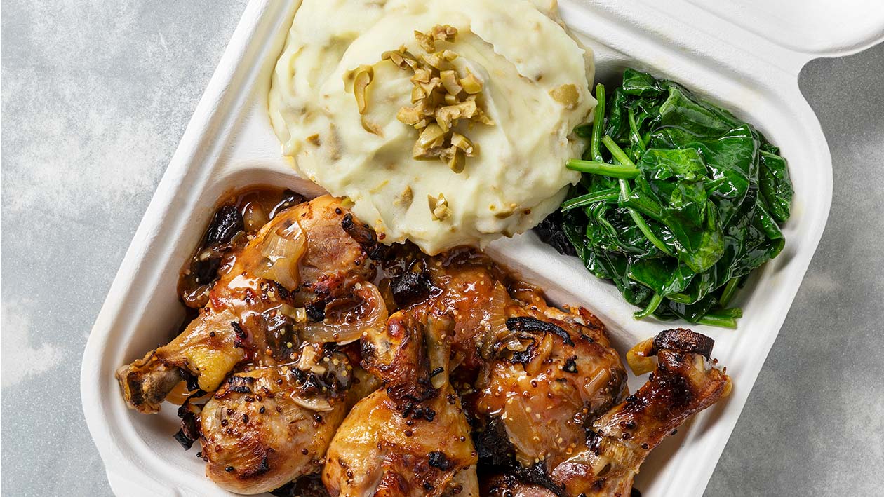 • Servir as pernas de frango assadas com oKnorr Puré de Batatacom azeitonas e espinafres salteados.